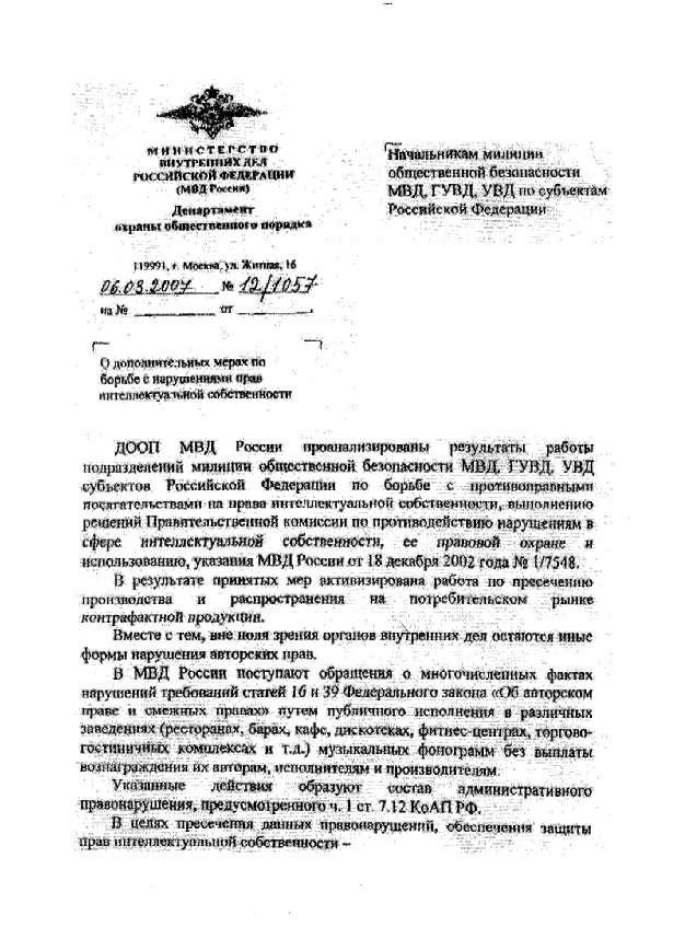 Вместе с тем, вне поля зрения органов внутренних дел остаются иные формы нарушения авторских прав. В МВД России поступают обращения о многочисленных фактах нарушений требований статей 16 и 39 Федерального закона «Об авторском праве и смежных нравах» путем публичного исполнения в различных заведениях (ресторанах, барах, кафе, дискотеках, фитнес-центрах, торгово-гостиничных комплексах и т.д.) музыкальных фонограмм без выплаты вознаграждения их авторам, исполнителям и производителям. Указанные действия образуют состав административного правонарушения, предусмотренного ч. 1 ст. 7.12 КоАП РФ.