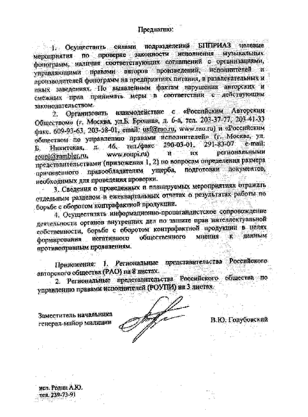Предлгаю: 1. Осуществить силами подразделений БППРИАЗ целевые мероприятия по проверке законности исполнения музыкальных фонограмм, наличия соответствующих соглашений с организациями, управляющими правами авторов произведений, исполнителен и производителей фонограмм па предприятиях питания, в развлекательных и иных заведениях. По выявленным фактам нарушения авгорских и Смежных нрав принимать меры в соответствии с действующим законодательством. 2. Организовать взаимодействие с «Российским Авторским Обществом» (г. Москва, ул. Б. Бронная, д. 6-а, тел. 203-3777, 203-41-33 факс. 609-93-63, 203-584)) и «Российским обществом по управлению правами исполнителей» (г. Москва, ул, Б. Никитская, д. 46, тел./факс 2904)3-01, 291-83-07 ) и их региональными представительствами (приложения 1, 2) но вопросам определения размера причиненного правообладателям ущерба, подготовки документов, необходимых для проведения проверки. 3. Сведения о проведенных и планируемых мероприятиях отражать отдельным разделом в ежеквартальных отчетах о результатах работы по борьбе, с оборотом контрафактной продукции, 4. Осуществлять информационноо-пропагандистское сопровождение деятельности органов внутренних дел по защите прав интеллектуальной собственности, борьбе с оборотом контрафактной продукции в целях формирования негативного общественного мнения к данным противоправным проявлениям.