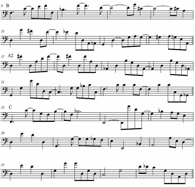 Характерным узнаваемым элементом являются скачки, которые достигают полутора и даже двух октав. Насыщение партии сбивками, исполненными восьмыми, создает четкую ритмическую пульсацию, имитирует игру на перкуссионных ударных инструментах, являющихся визитной карточкой латиноамериканской музыки. Такой прием также создает эффект, подобный полифонии, где различные независимые голоса проводятся контрабасом с одной стороны и как бы ударными с другой стороны.