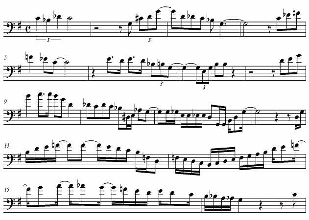 Подражая другим инструментам ансамбля, контрабасисты этого периода понемногу начинают играть контрабасовые соло, достаточно развитые и похожие на соло духовых инструментов и фортепиано. Так, в пьесе «Bag’s Groove» Милта Джексона ([1], стр. 34) импровизация контрабаса и фактурно, и по диапазону напоминает, скорее, соло саксофона, разительно отличаясь от предыдущего примера.