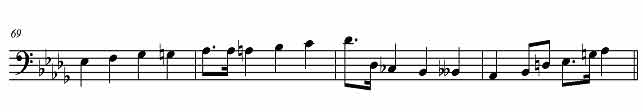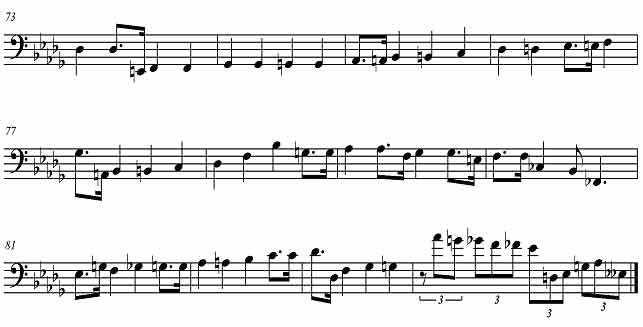 Аккомпанемент же в фортепианном соло практически полностью исполняется четвертями со сложными сбивками и скачками, порой превышающими полторы октавы.